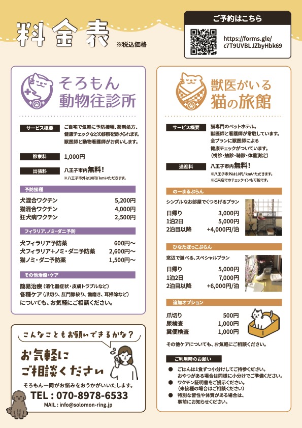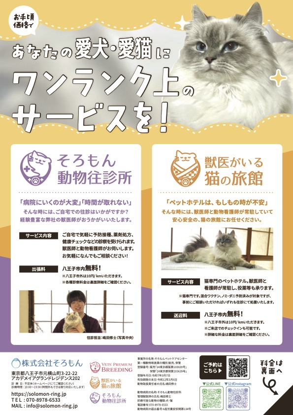 2025.03.23 2025.10.31 未分類 営業開始日について solomon そろもん動物往診所および獣医がいる猫の旅館の営業開始日は3/26(水)~となります。※営業開始日前のご予約はもちろん受け付けております。